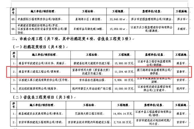 由南昌市第二建筑工程公司承建的江西旺旺新建廠房1#車間工程獲“2015年度江西省優(yōu)良工程獎”,宜春市明月大橋(原宜春大橋)改建及引道工程榮獲“2015年度江西省杜鵑花獎”[摘自江西省住房和城鄉(xiāng)建設(shè)廳文件贛建質(zhì)字[2016]5號]。